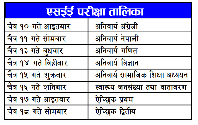 यस बर्षको एसईई परीक्षा चैत्र १० गतेबाट शुरु भई सामान्यतर्फका चैत्र १८ गते सकिने छ भने प्राविधिकतर्फको चैत्र २१ गते सकिने छ।