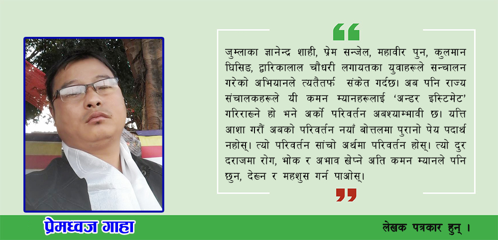 सुरुवातमा भनेजस्तै देशको मुख्य समस्या पटक पटकको परिवर्तन पश्चात पनि सर्वसाधारणको तहसम्म परिवर्तन नपुग्नु हो अर्थात परिवर्तन, नाम मात्रको परिवर्तनमा सीमित हुनु हो। यहां जनताले महशुस गर्ने गरी परिवर्तन नै भएन। परिवर्तनको रुप पक्ष र सार पक्ष मेल नखांदाको परिणाम हो वर्तमान स्थिति। वर्तमान स्थिति अर्थात अस्थिरता, अभाव, वेरोजगार, हत्या, हिंसा, बौद्धिक पलायन, भ्रष्टाचार, अब्यबस्था। जनताको अज्ञानता, चेतनाको कमी, दरिद्रता, अशिक्षा र गरिबीको फाइदा लिंदै जसरी राजनीतिक नेतृत्वले हालसम्म जुन तरिकाले राज्य संचालन गरे अब त्यही ढंगले देश अगाडि बढ्नै सक्दैन भन्ने अब बिस्तारै सबैलाई महशुस हुंदैछ। समृद्धिको सपना लगातार बाँडिरहेको वर्तमान सत्ताप्रति बिस्तारै औंला उठ्न थालिसकेका छन्। राजसंस्थाकालीन परिस्थितिबाट लोकतान्त्रिक गणतन्त्रात्मक युगमा प्रवेश भए पछिको संविधान र त्यस संविधान अनुरुपको निर्वाचन पछिको पहिलो सरकार नेकपा सरकार पनि जनमुखी बन्न नसक्दा यसको पनि ‘काउण्ट डाउन’ शुरु भैसकेको छ। जुम्लाका ज्ञानेन्द्र शाही, प्रेम सन्जेल, महावीर पुन, कुलमान घिसि·, द्वारिकालाल चौधरी लगायतका युवाहरुले सन्चालन गरेको अभियानले त्यतैतर्फ संकेत गर्दछ। अब पनि राज्य संचालकहरुले यी कमन म्यान ९अयmmयल mबल० हरुलाई ‘अन्डर इस्टिमेट’ गरिराख्ने हो भने अर्को परिवर्तन अबश्याम्भावी छ। यत्ति आशा गरौं अबको परिवर्तन नयाँ बोत्तलमा पुरानो पेय पदार्थ नहोस्। त्यो परिवर्तन सांचो अर्थमा परिवर्तन होस्। त्यो दुर दराजमा रोग, भोक र अभाव खेप्ने अति कमन म्यानले पनि छुन, देख्न र महशुस गर्न पाओस्।