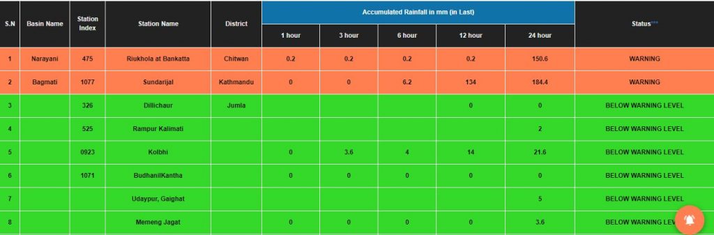 लगातारको वर्षाका कारण नारायणी नदीमा बाढी आएको छ । नारायणी नदीमा आएको बाढीका कारण चितवन आसपास नदी तटीय क्षेत्रमा बसोबास गर्ने नागरिकलाई उच्च सतर्कता उपनाउन बाढी पूर्वानुमान महाशाखाले आग्रह गरेको छ ।