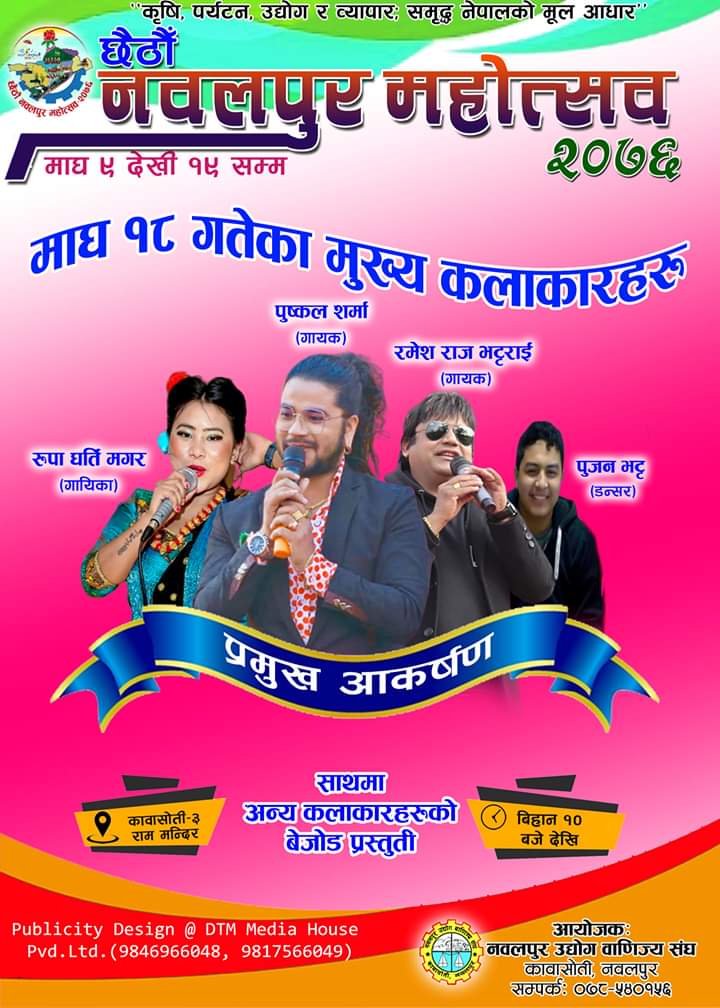 कावासाेती। नवलपुर महाेत्सवमा आज गायक पुष्कल शर्मा, रमेश राज भट्टराई, गायिका रूपा घर्ती मगर लगायतका कालाकारहरू आउने भएका छन् ।