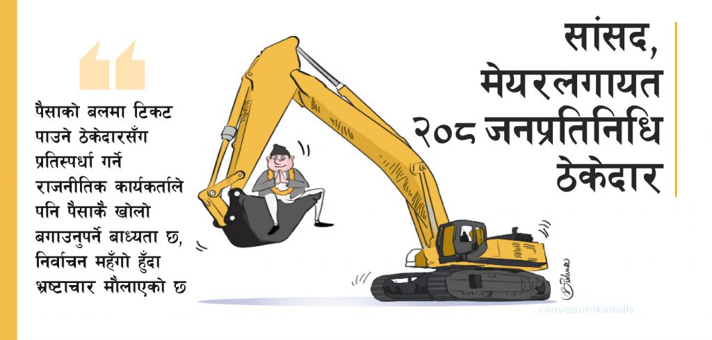 निर्वाचनमा सजिलै टिकट कसले पाउँछ ? जसले राजनीतिक नेतृत्वलाई पैसा दिन्छ । पैसाको बलमा टिकट पाउने ठेकेदारले मात्र होइन, ठेकेदारसँग प्रतिस्पर्धा गर्ने राजनीतिक कार्यकर्ताले पनि पैसाकै खोलो बगाउनुपर्ने बाध्यता छ । यसरी निर्वाचन महँगो हुँदा भ्रष्टाचार मौलाएको छ ।