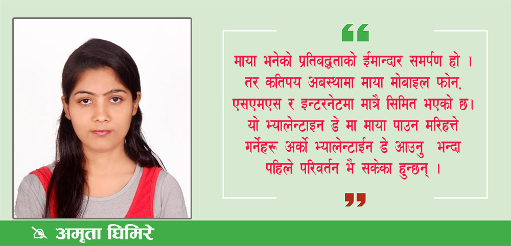 माया भनेको प्रतिबद्धताको ईमान्दार समर्पण हो । तर कतिपय अबस्थामा माया मोबाइल फोन, एसएमएस र इन्टरनेटमा मात्रै सिमित भएको छ । यो भ्यालेन्टाइन डे मा माया पाउन मरिहत्ते गर्नेहरु अर्को भ्यालेन्टाईन डे आउनु भन्दा पहिले परिवर्तन भै सकेका हुन्छन् ।
