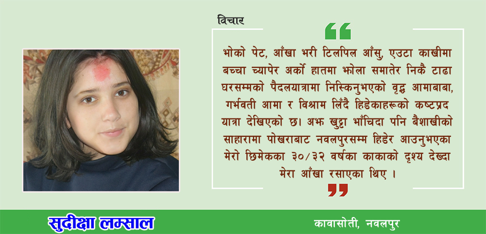 सधैं साधनको घन्को सुनिरहेको यी कानले विश्राम पाएको र यी आँखाले बाटोमा फरक दृश्य देखेको आज ठ्याक्कै एक महिना पुगेछ । भोको पेट, आँखा भरी टिलपिल आँसु, एउटा काखीमा बच्चा च्यापेर अर्को हातमा झोला समातेर निकै टाढा घरसम्मको पैदलयात्रामा निस्किनु भएको वृद्ध आमाबाबा, गर्भवती आमा र विश्राम लिँदै हिडेकाहरुको कष्टप्रद यात्रा देखिएको छ । अझ खुट्टा भाँचिदा पनि बैशाखीको साहारामा पोखराबाट नवलपुरसम्म हिडेर आउनुभएका मेरो छिमेकका ३०–३२ वर्षका काकाको दृश्य देख्दा मेरा आँखा रसाएका थिए । हरेक दिन जसो रेडियो, टेलिभिजन र ईन्टरनेटमा सामाचार आउने गर्छ, कोभिड–१९ र यसले निम्त्याएका समस्याहरु भनेर । सुन्निछ मजदुरहरु सहरमा भोकमरीसँग जुध्न नसकेर सुख–दुख परिवारसंगै साटौला भन्दै भोक, प्यास, थकानको प्रवाह नगरी आफ्नो घर फर्कदै छन् ।