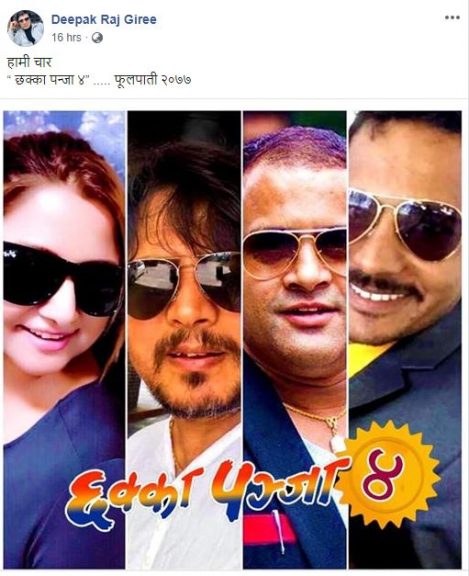 चलचित्र ‘छक्कापन्जा–४’ विगतको भन्दा ठूलो क्यानभासमा निर्माण गर्नुपर्ने हुन्छ । यो चलचित्रको स्क्रिप्टलेखन कार्य अन्तिम चरणमा पुगेको थियो । ‘छक्कापन्जा–४’ लाई आगामी दसैंको अवसर पारेर कात्तिक ७ गते रिलिज गर्ने तयारी हुँदै थियो । सो मितिमा रिलिज गर्न चलचित्रको छायांकन जेठको दोस्रो साताबाट सुरु गर्नुपर्ने थियो । तर, अहिलेको अवस्थाले अझै चलचित्रको बजार कम्तीमा एक वर्ष अन्योल रहने भएपछि दीपकराज गिरी, दीपाश्री निरौला र उनको टिमले निर्माणबाट हात झिकेको हो । करिब ३ करोड बजेटको यो फिल्म अहिलेको अवस्थामा जोखिम पूर्ण देखिएको पनि दीपकको कथन छ ।