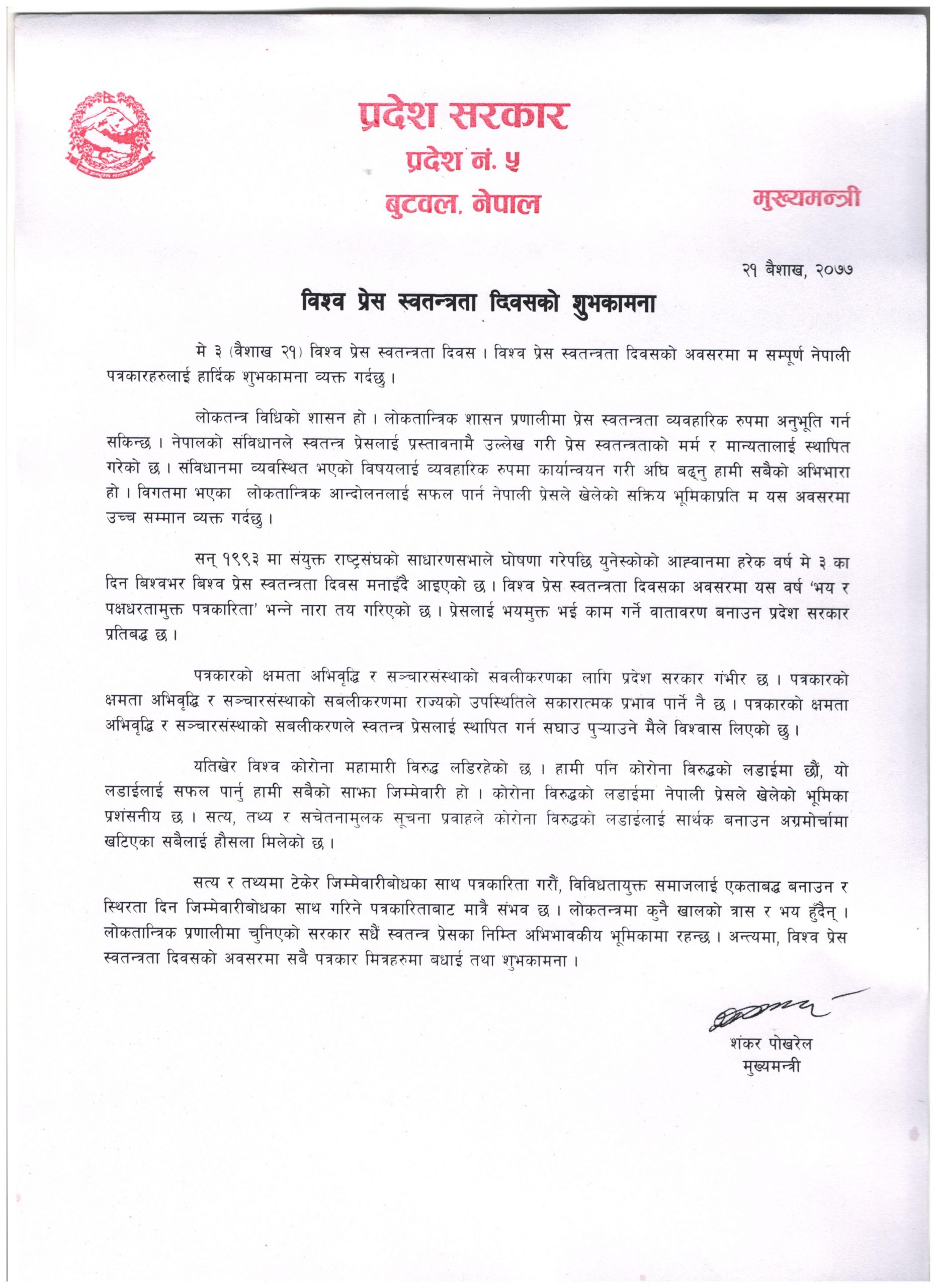 मुख्यमन्त्री पोख्रेलले शुभकामना सन्देशमा भनेको छन् – विगतमा भएको लोकतान्त्रिक आन्दोलनलाई सफल पार्न नेपाली प्रेसले खेलेको सक्रिय भूमिका प्रति यस अवसरमा म उच्च सम्मान गर्दछु ।