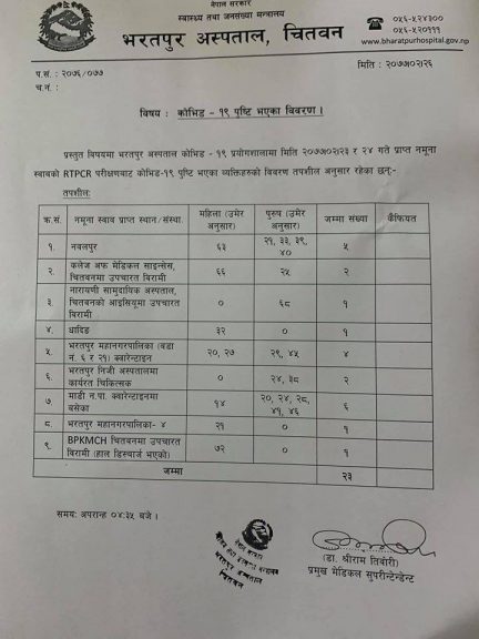 चितवनमा एकैदिन २३ जनामा कोरोना पुष्टि