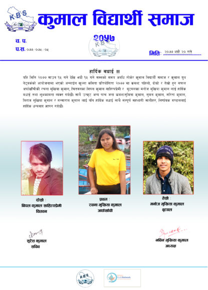 यामु कुमाल, कुमाल बिद्यार्थी समाज र कुमाल युथ नेटवर्कको संयुक्त आयोजनामा आयोजित “खुल्ला अनलाईन कविता लेखन प्रतियोगिता २०७७” मा अर्घाखाँचीकी रचना मुखिया कुमाल प्रथम भएकी छिन् ।