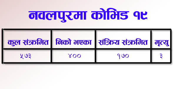 यो सहित नवलपुरमा संक्रमितको संख्या ५ सय ७३ जना पुगेको छ । नवलपुरमा ३ जनाले संक्रमणको कारण ज्यान गुमाएको छ । नवलपुरमा अहिले १७० जना संक्रिय संक्रमित रहेका छन् ।