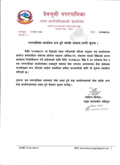 देवचुली । पूर्वी नवलपरासीको देवचुली नगरपालिकाको कार्यालय ३ दिनको लागि बन्द भएको छ । नगरपालिकामा कार्यरत कर्मचारीमा संक्रमण पुष्टि भएपछी आज २८ गते देखि ३० गते ३ दिन सम्मको लागि नगरपालिका कार्यालय बन्द भएको हो ।