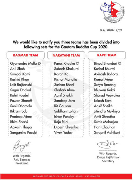 आयोजकले बुधबार बागमती, राप्ती र नारायणी नामको तीन टोलीको घोषणा गरेको हो । राष्ट्रिय टिमका कप्तान ज्ञानेन्द्र मल्लले बागमतीको कप्तानी गर्नेछन् भने अलराउण्डर पारस खडकाले नारायणी टिमको कप्तानी गर्नेछन् । यस्तै विनोद भण्डारीले भेरीको कप्तानी गर्नेछन् ।