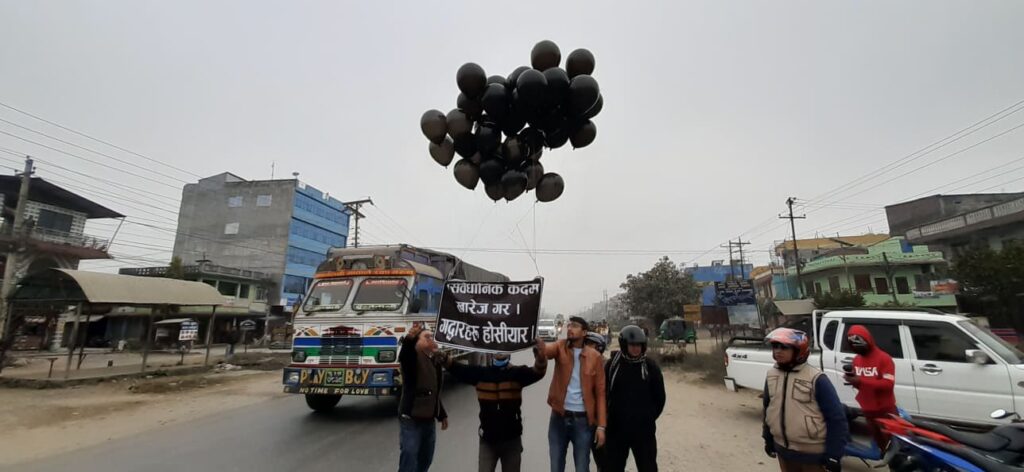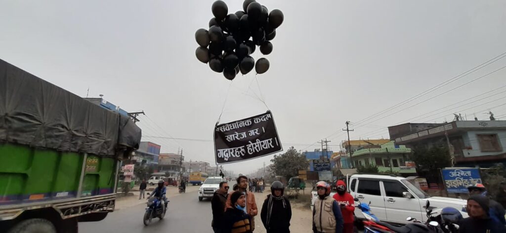 मन्त्री रायमाझीलाई उनीहरुले कावासोतीको थकाली चोकबाट असंवैधानिक कदम खारेज गर, गद्दारहरु होसियार लेखेको कालो व्यानर बेलुनमा बाँधेर उडाई विरोध जनाएका थिए ।