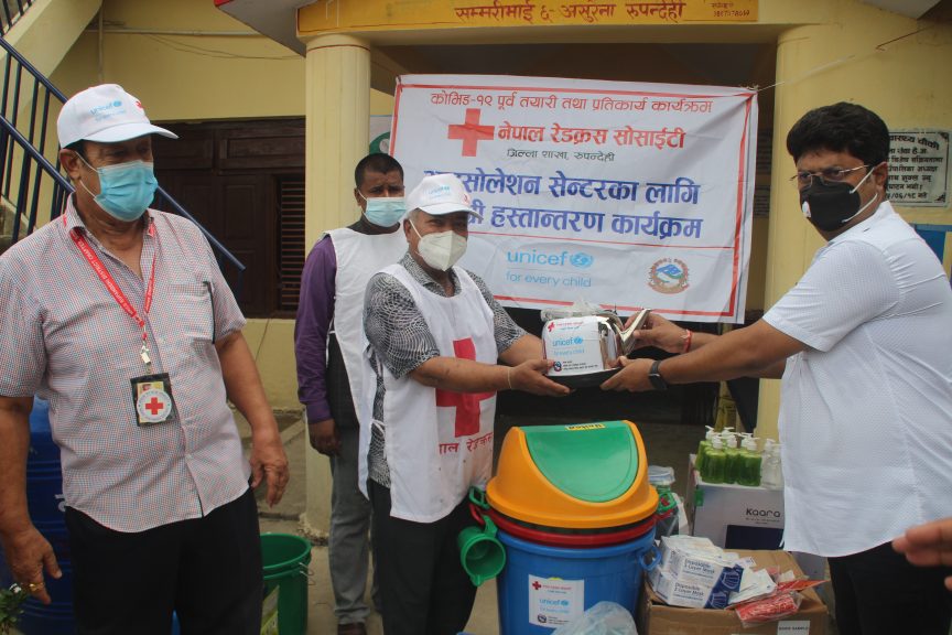 नेपाल रेडक्रस सोसाइटी रुपन्देहीले युनिसेफ नेपालको साझेदारीमा सञ्चालित कोभिड–१९ पूर्व तयारी तथा प्रतिकार्य कार्यक्रम अन्तर्गत रुपन्देहीका तीन स्थानीय तहहरूको आइसोलेशन सेन्टरलाई स्वास्थ्य सामाग्री सहयोग गरेको छ ।