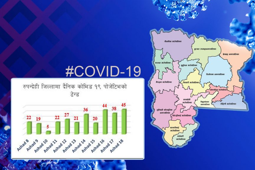 स्वास्थ्य कार्यालय रुपन्देहीको पछिल्लो तथ्याङ्क अनुसार जिल्लामा दुई सय १० जनामा कोरोना परिक्षण गर्दा ४५ जना नयाँ कोरोना संक्रमित थपिएका छन् । जुन पछिल्लो १८ दिन यताकै सबैभन्दा उच्च हो ।