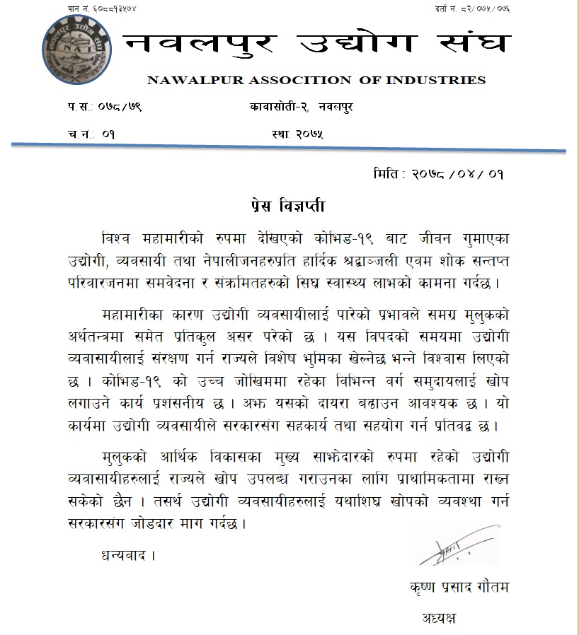 नवलपुर उद्योग संघ नवलपुरका अध्यक्ष कृष्णप्रसाद गौतमले शुक्रबार एक विज्ञप्ति जारी गर्दै मुलुकको आर्थिक विकासको मुख्य साझेदारको रुपमा रहेको उद्योगी व्यवसायीहरुलाई राज्यले कोभिड १९ विरुद्धको खोप उपलब्ध गराउने कुरामा प्राथमिकतमा नराखेको उल्लेख गर्दै तत्काल खोप उपलब्ध गराउन माग गरेका हुन् ।
