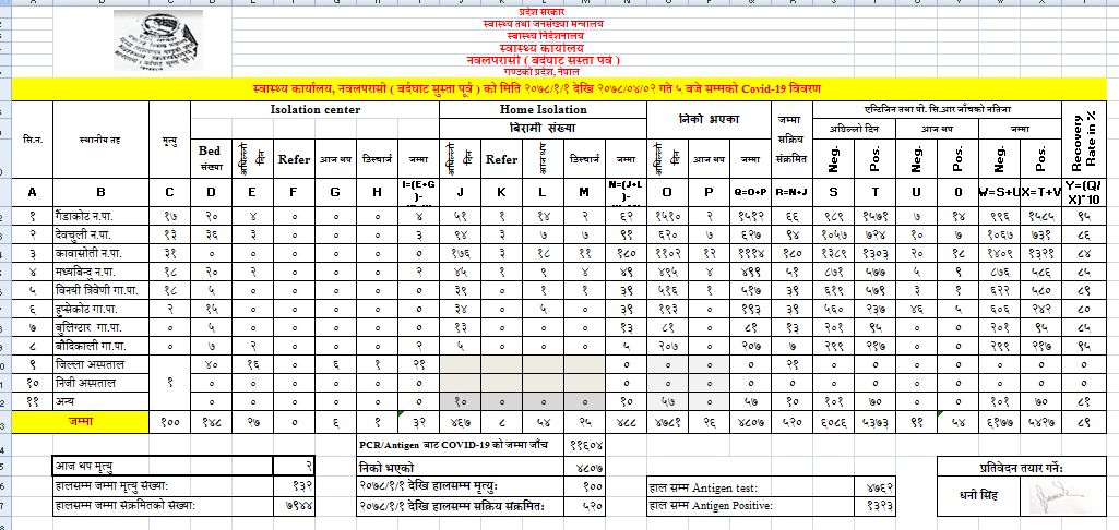 जिल्ला स्वास्थ्य कार्यालय नवलपुरका अनुसार शनिबार मात्रै ५४ जना नयाँ संक्रमित थपिएका छन् । शनिबार नवलपुरमा २६ जना मात्र निको भएको छ ।