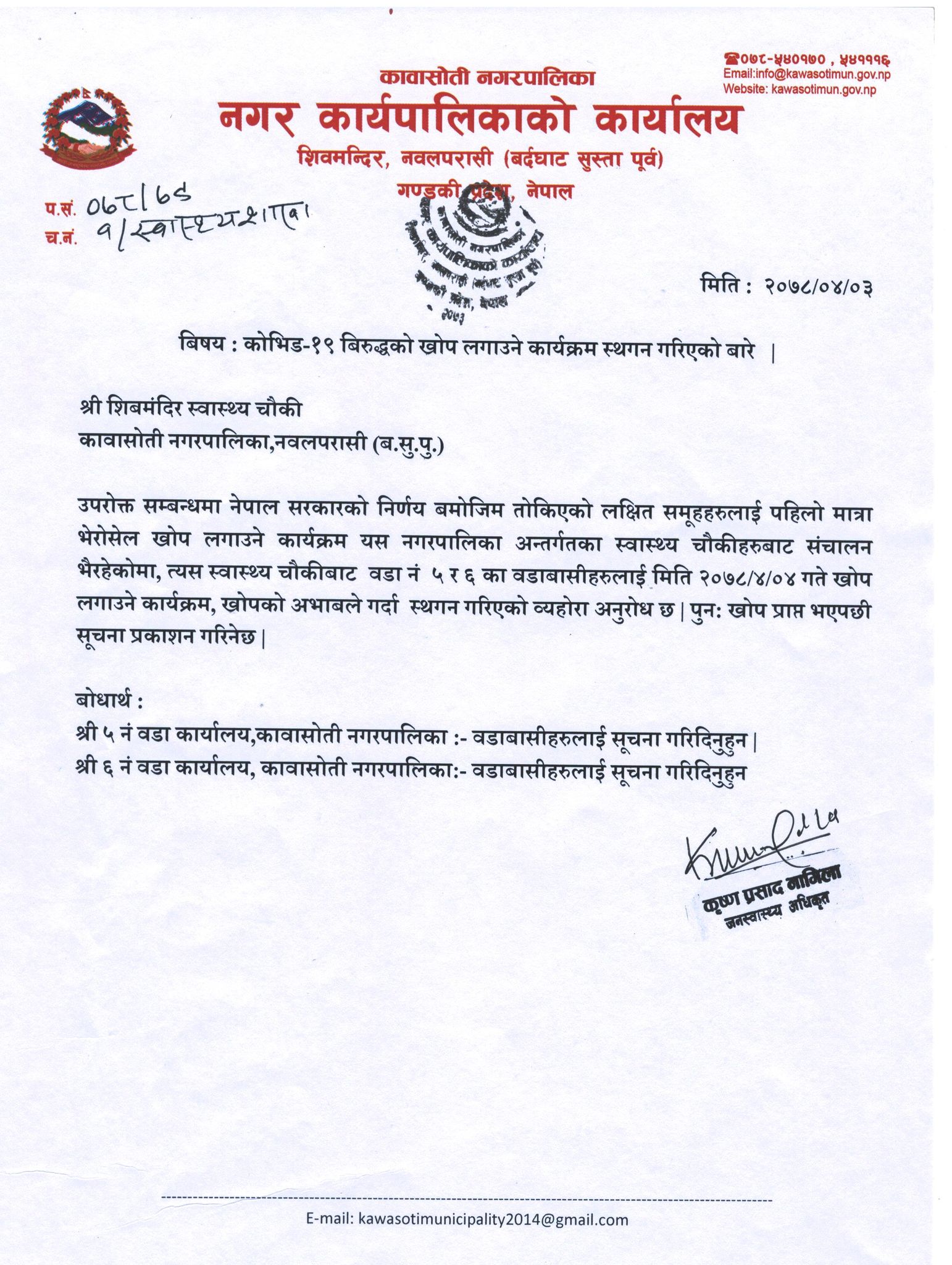कावासोतीमा प्राप्त करिब ५ हजार खोप ३ दिनमै सकिएकोले भोलि कावासोती ४ र ५ मा लगाउने भनिएको खोप तत्कालका लागि स्थगित गरिएको र अर्को खोप प्राप्त हुन साथ लगाइने स्वास्थ्य शाखा कावासोतीले जनाएको छ ।