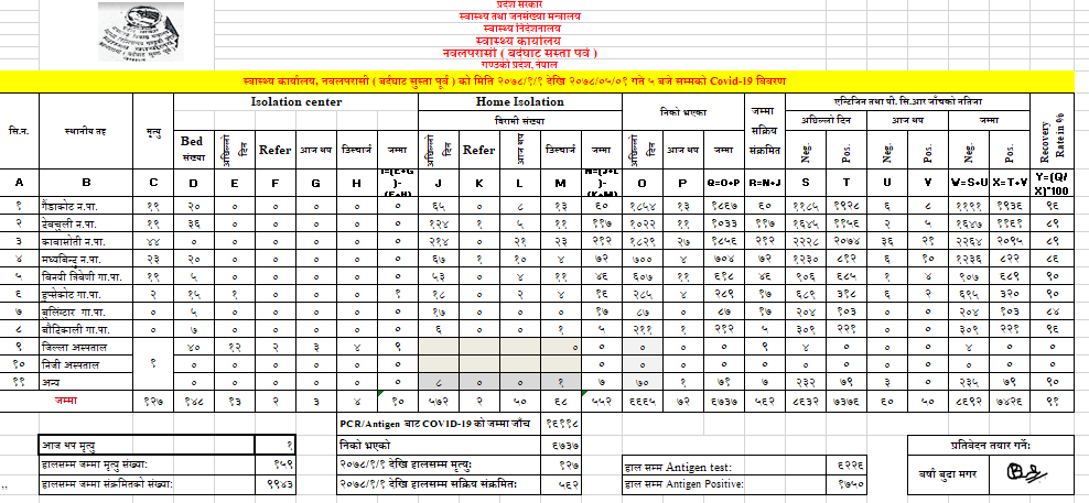 मंगलबारसम्म सक्रिय संक्रमितको संख्या गैडाकोटमा ७२, देवचुलीमा ७५, कावासोतीमा ८९, मध्यविन्दुमा ४०, विनयी त्रिवेणीमा ३७, हुप्सेकोटमा ९, बुलिङटारमा १७ र बौदीकालीमा ५ जना रहेका छन् ।