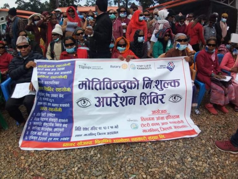 तिलगंगा आँखा प्रतिष्ठान काठमाडौँकी लिना बज्राचार्यको नेतृत्वमा डा. अनिमा देसार, डा. क्षितिज जङ्ग सो लगायत १५ जनाको समूह तथा शिविर कमाण्डर महेश पराजुलिज्युको संयोजकत्वमा भएको उक्त शिविरमा १८३जनाको निःशुल्क मोतियाविन्दुको अप्रेशन भएको छ ।