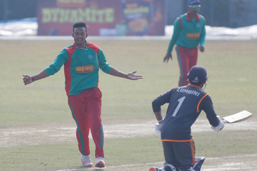 लुम्बिनीका अजय चौहानले सर्वाधिक ५ विकेट लिए । यस्तै दुर्गेश गुप्ताले ३ तथा मोहम्मद हुसेनले २ विकेट हात पारे ।