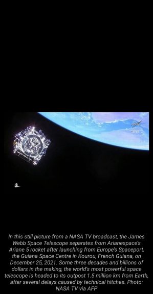 NASA’s James Webb Space Telescope, built to give the world a glimpse of the universe as it existed when the first galaxies formed, was launched by rocket early on December 25 from South America’s northeastern coast, opening a new era of astronomy.The revolutionary $9-billion infrared telescope, hailed by NASA as the premier space-science observatory of the next decade, was carried aloft inside the cargo bay of an Ariane5 rocket that blasted off atabout 7.20 a.m. EST (5.50 p.m. IST) from the European Space Agency’s (ESA) launch base in French Guiana.