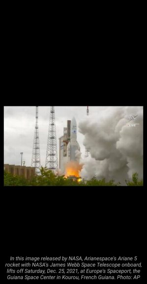 NASA’s James Webb Space Telescope, built to give the world a glimpse of the universe as it existed when the first galaxies formed, was launched by rocket early on December 25 from South America’s northeastern coast, opening a new era of astronomy.The revolutionary $9-billion infrared telescope, hailed by NASA as the premier space-science observatory of the next decade, was carried aloft inside the cargo bay of an Ariane5 rocket that blasted off atabout 7.20 a.m. EST (5.50 p.m. IST) from the European Space Agency’s (ESA) launch base in French Guiana.