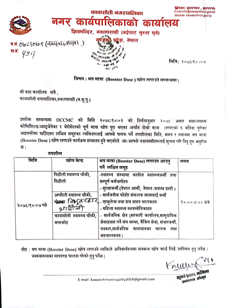 त्यसैगरी अन्य पालिकाहरुमा माघ १० गते आसपास बुष्टर डोज खोप लगाउन शुरु हुने स्वास्थ्य कार्यालय नवलपुरका प्रमुख केशव चापागाईले बताए । बुष्टर डोज अर्थात तेस्रो मात्रा खोप लगाउन दोस्रो मात्रा लगाएको ६ महिना कटेको हुनुपर्ने कावासोती स्वास्थ्य शाखा प्रमुख कृष्ण नागिलाले बताए ।