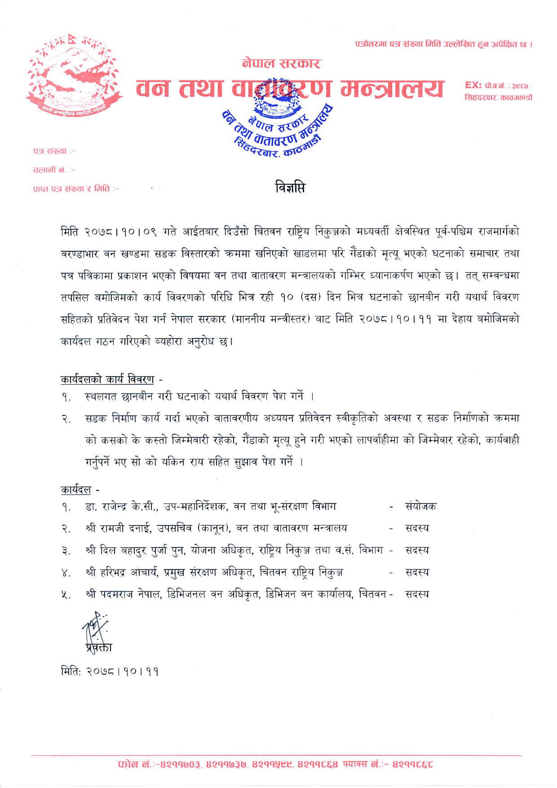 वन तथा भूसंरक्षण विभागका उपमहानिर्देशक डा. राजेन्द्र केसीको संयोजकत्वमा पाँच सदस्यीय कार्यदल बनाइएको मन्त्रालयले जनाएको छ ।