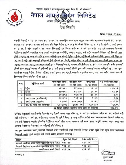 चालु आर्थिक वर्षको माघ मसान्तसम्ममा निगमले करीब रू. २४ अर्व नोक्सानी व्यहोरी सकेकोले पेट्रोलियम पदार्थ खरिद वापत आवश्यक पर्ने रकम जुटाइ आपूर्ति व्यवस्था सहज बनाइ राख्न आगामी दिनहरूमा निगमलाई थप कठिनाई हुने देखिएको पनि निगमको भनाइ छ ।
