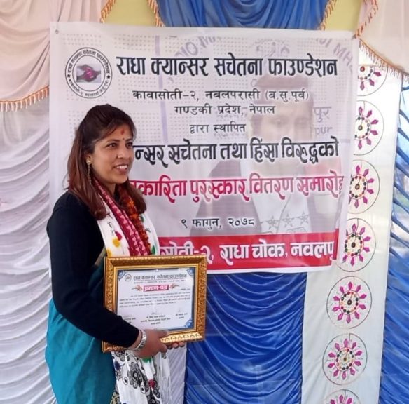राधा क्यान्सर सचेतना पत्रकारिता पुरस्कारबाट चितवनकी पत्रकार ज्योति अधिकारी पुरस्कृत
