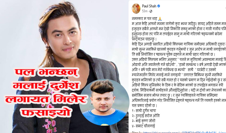 ती गायिकालाई प्रयोग गरेर दुर्गेश थापा, सरोज ओली, कृष्ण जोशी र सम्राट चौलागाईले नियोजित ढङ्गले षड्यन्त्र गर्ने पलको दाबी छ ।
