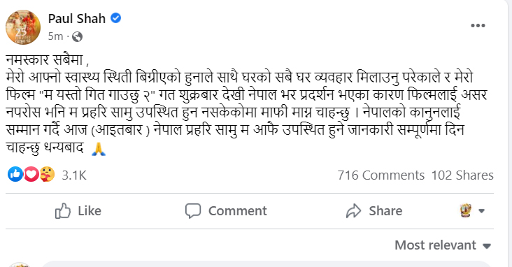 मेरो आफ्नो स्वास्थ्य स्थिती बिग्रीएको हुनाले साथै घरको सबै घर व्यवहार मिलाउनु परेकाले र मेरो फिल्म ूम यस्तो गित गाउछु २ू गत शुक्रबार देखी नेपाल भर प्रदर्शन भएका कारण फिल्मलाई असर नपरोस भनि म प्रहरि सामु उपस्थित हुन नसकेकोमा माफी माग्न चाहन्छु । नेपालको कानुनलाई सम्मान गर्दै आज ९आइतबार ० नेपाल प्रहरि सामु म आफै उपस्थित हुने जानकारी सम्पूर्णमा दिन चाहन्छु धन्यबाद i