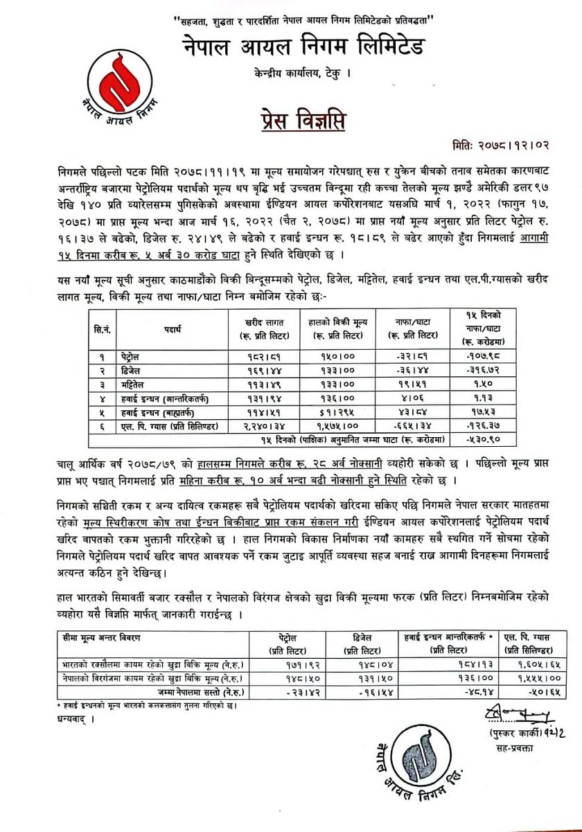 यससँगै आगामी १५ दिनमा करीब रू ५ अर्ब ३० करोड घाटा हुने स्थिति देखिएको निगमले बुधबार जारी गरेको विज्ञप्तिमा उल्लेख छ। निगमले पछिल्लो पटक फागुन १९ मा मूल्य समायोजन गरेको थियो ।