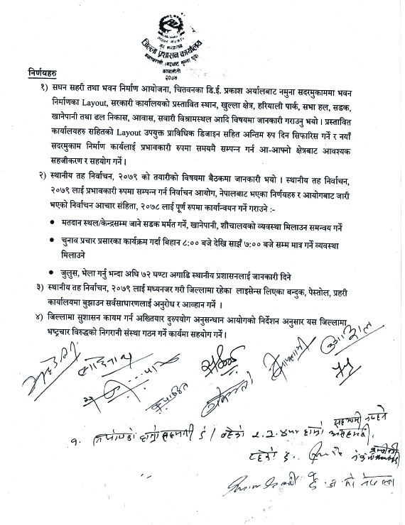 त्यस्तै जिल्ला भित्र सर्वसाधारण नागरिकसँग रहेको लाइसेन्स भएका वा नभएका बन्दुक लगायतका हातहतियारहरु प्रशासनलाई बुझाउन आग्रह गर्ने निर्णय पनि गरेको छ ।