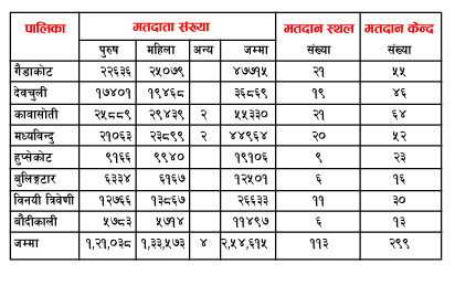 सबैभन्दा धेरै मतदाता कावासोतीमा ५५ हजार तीन सय ३० जना छन् भने सबैभन्दा कम बौदिकालीमा ११ हजार ४ सय ९७ मतदाता रहेको आयोगले जनाएको छ ।