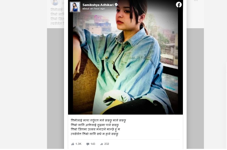 गायिका समिक्षा अधिकारीले मायाका लागि आफू हार्न तयार रहेको भन्दै स्टाटस लेखेकी छिन् । उनको र पल शाहको विवाह पक्का पक्की भएको चर्चाहरु बाहिरिरहेको बेला उनको यो स्टाटस आएको हो ।
