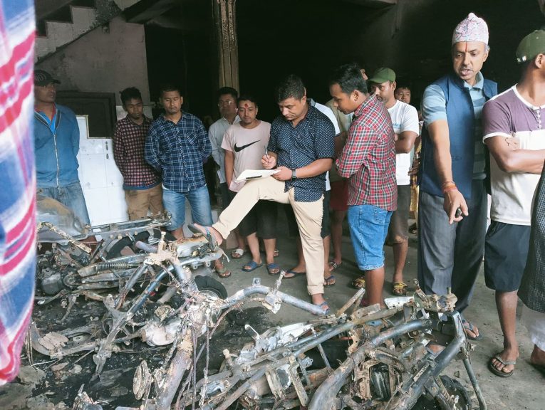 त्यहाँ भुइतलामा रहेको मोटरसाइकल ग्यारेजमा आगजनी गरेर ४ वटा मोटरसाइकलमा क्षति पुर्याइएको थियो । राप्रपाका जिल्ला अध्यक्ष विष्णु अधिकारीले एक विज्ञप्ति निकालेर घटना छानबिनको माग गरेका छन् ।
