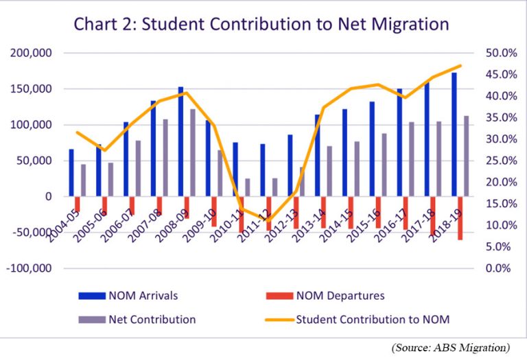 सन् २०१४।१५ देखि अष्ट्रेलियाको खुद आप्रवासनमा विदेशी विद्यार्थीहरुको हिस्सा ४० प्रतिशत रहेको छ । कोरोना भाइरस महामारी सुरु हुनु अगाडि सन् २०१८।१९ मा अष्ट्रेलियामा विदेशीहरुको खुद आप्रवासनमा विदेशी विद्यार्थीको हिस्सा करीब ४७ प्रतिशत पुगेको थियो ।