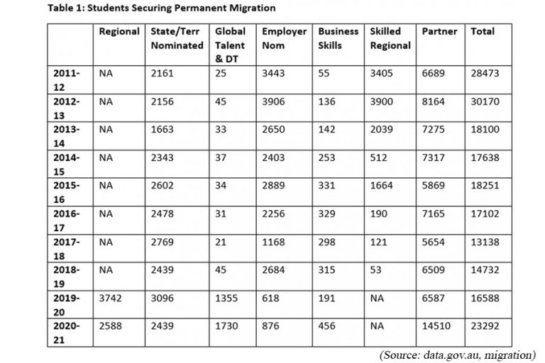 अष्ट्रेलियामा स्थायी आप्रवासन गर्ने सीपयुक्त जनशक्तिमा विद्यार्थीको योगदान उल्लेख्य छ । सन् २०२०।२१ मा अष्ट्रेलियामा स्थायी आप्रवासन हासिल गर्न सफल विदेशी विद्यार्थीको संख्या २३ हजार २९२ रहेको छ ।