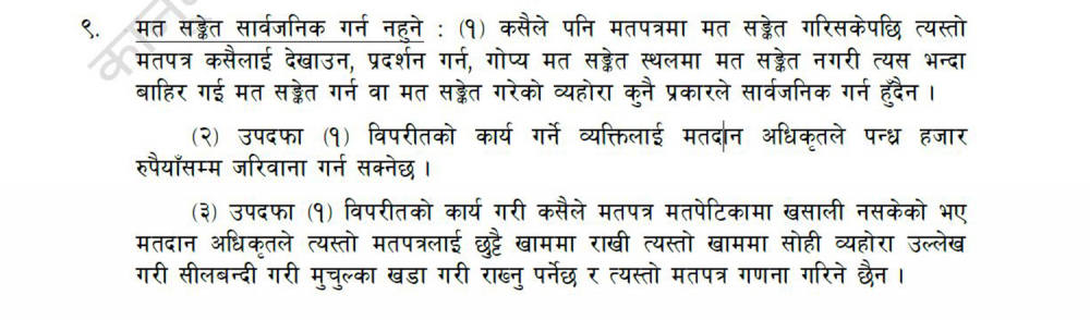 ‘कसैले पनि मतपत्रमा मत संकेत गरिसकेपछि त्यस्तो मतपत्र कसैलाई देखाउन, प्रदर्शन गर्न, गोप्य मत संकेत स्थलमा मत संकेत नगरी त्यसभन्दा बाहिर गई मत संकेत गर्न वा मत संकेत गरेको व्यहोरा कुनै प्रकारले सार्वजनिक गर्न हुँदैन,’ ऐनमा व्यवस्था गरिएको छ । त्यसो गरिएको अवस्थामा के भन्नेबारे उल्लेख छ, ‘उपदफा (१)विपरीतको कार्य गर्ने व्यक्तिलाई मतदान अधिकृतले १५ हजार रुपैयाँसम्म जरिवाना गर्न सक्छ ।’