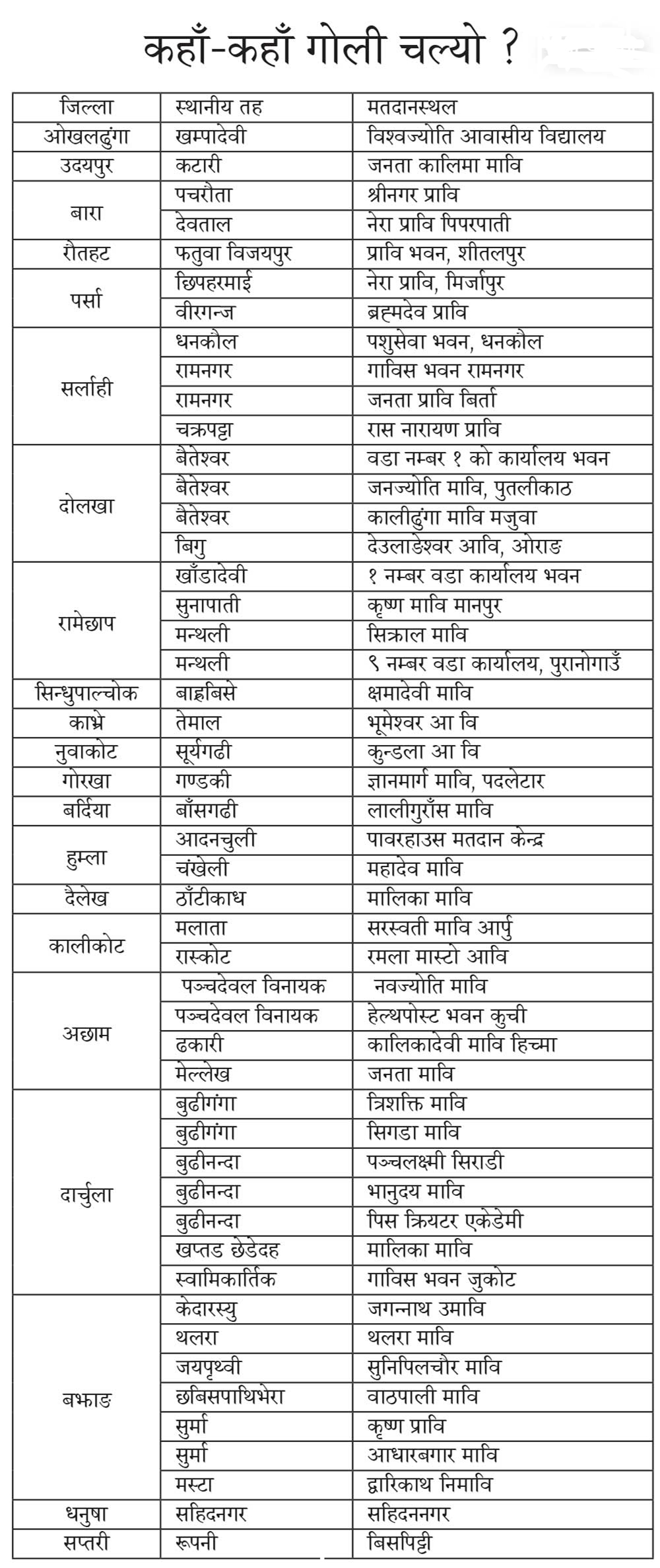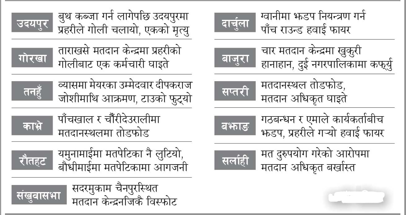 प्रहरी प्रधान कार्यालयका अनुसार धनुषा, दोलखा, काभ्रे, बारा, रौतहट, पर्सा, रामेछाप, नुवाकोट, बर्दिया, हुम्ला, दैलेख, कालीकोट, डोल्पा, अछाम, दार्चुला, बाजुरा, बझाङका मतदानस्थलमा गोली चलेको हो ।