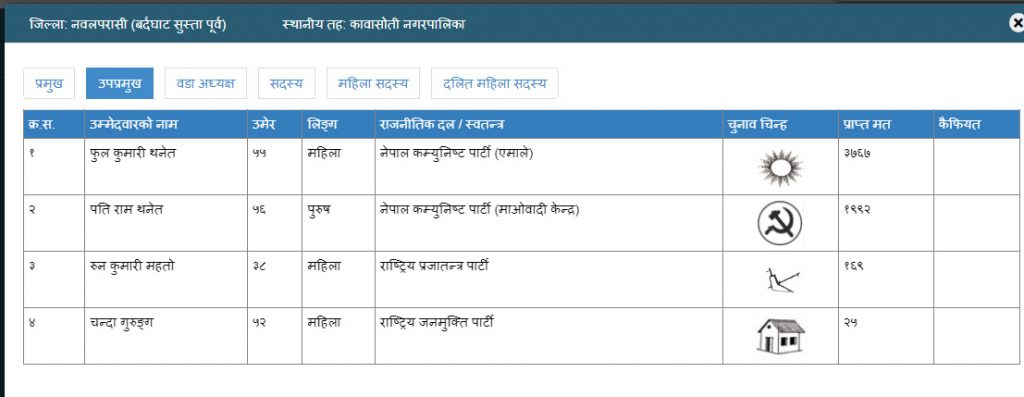 नगर उपप्रमुखमा अहिलेसम्म विभिन्न दल/स्वतन्त्र उम्मेदवारले प्राप्त गरेको मत विवरण
