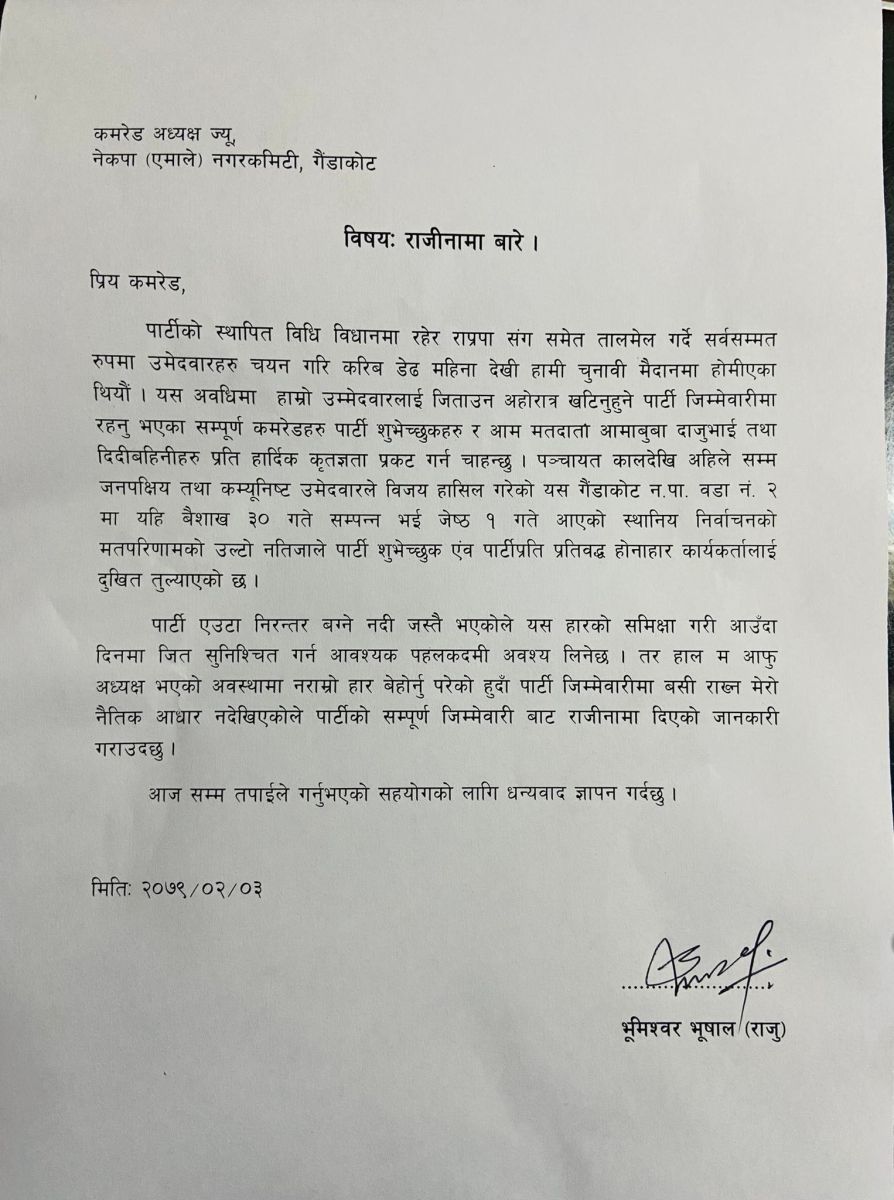 गैँडाकोट । नेकपा एमाले गैँडाकोट २ का अध्यक्ष भूूमिश्वर भूषाल (राजु)ले पदबाट राजिनामा दिनुभएको छ ।
