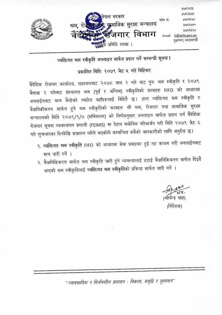 वैदेशिक रोजगारीसँग सम्बन्धित सेवा अनलाइनबाट प्रवाह गर्ने उद्देश्यअनुसार व्यक्तिगत श्रम स्वीकृति पनि अनलाइनबाट दिन लागिएको कार्यालयले जनाएको छ।