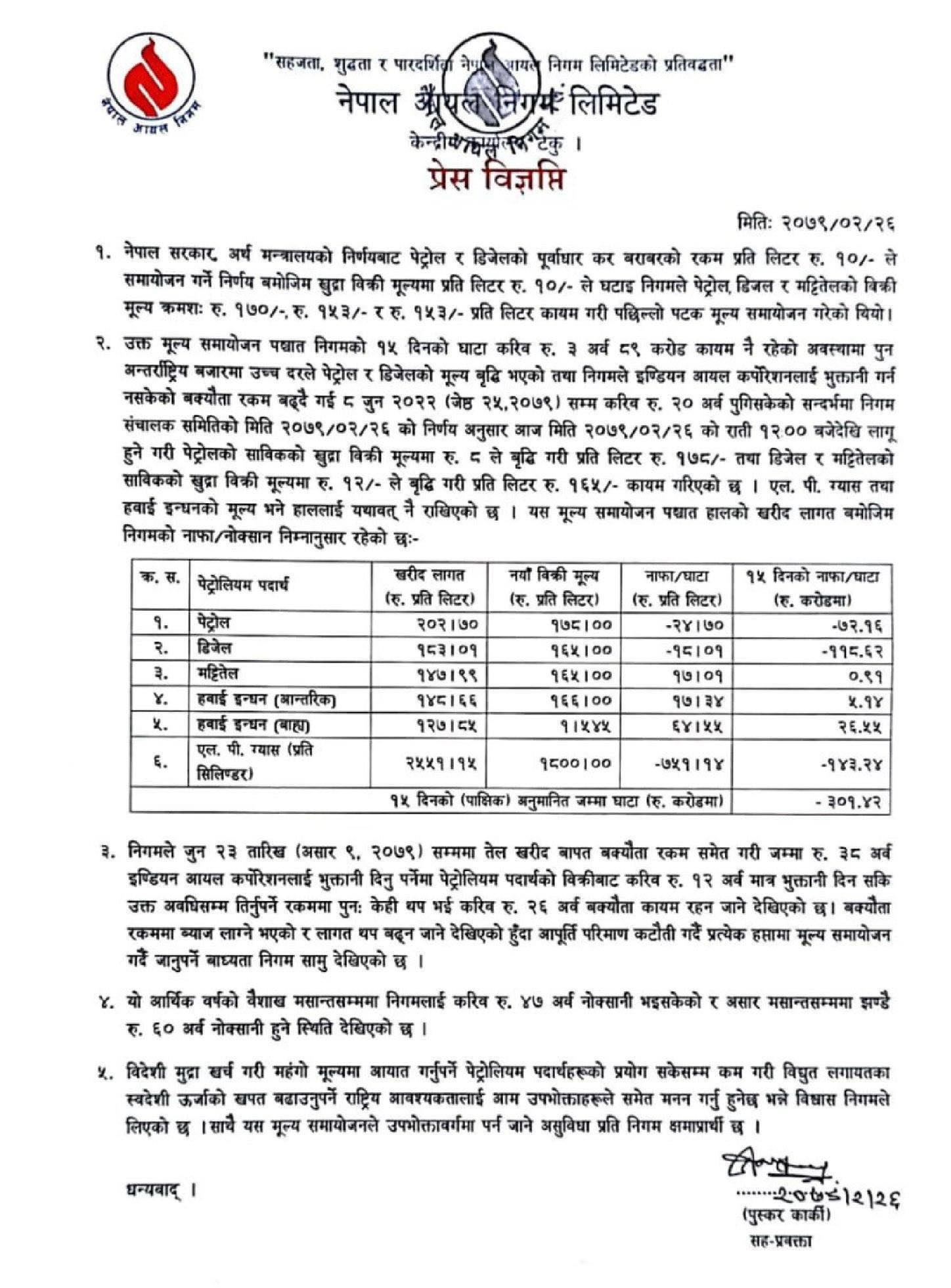 नयाँ मूल्यअनुसार एक लिटर पेट्रोलको मूल्य १७८ रुपैयाँ र डिजेल र मट्टितेलको समान १ सय ६५ रुपैयाँ प्रतिलिटर पर्नेछ ।