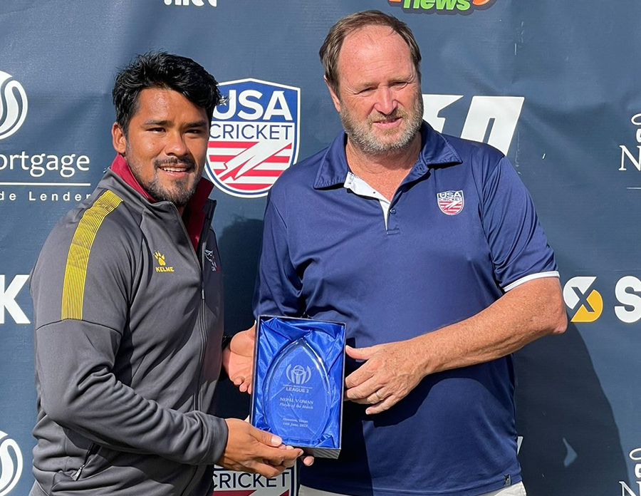 अमेरिकाको पर्ल्याण्डस्थित मोसा क्रिकेट स्टेडियममा करण केसीले ९ ओभरमा ३३ रन खर्चेर ५ विकेट लिएपछि ओमान १९ बल अघि नै १६३ रनमा अलआउट भयो । कप्तान सन्दीप लामिछानेले ३ विकेट लिए ।