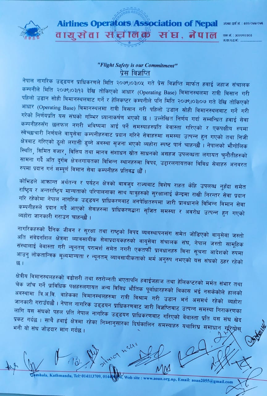 सरकारले विभिन्न कम्पनीका ५५ वटा जहाज र हेलिकप्टरहरूले राती काठमाडौंबाहिर तोकिएको आधार विमानस्थलमा पार्किङ गर्नुपर्ने निर्णयको विरोधमा संघले यस्तो निर्णय गरेको हो।