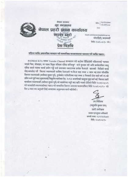 नवलपुरका प्रहरी उपरीक्षक प्रज्जवल महर्जनले उनलाई सोमबार पक्राउ गरी साइबर व्युरोमा पठाइएको बताए ।
