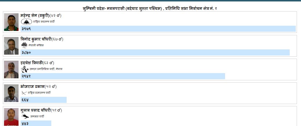 पश्चिम नवलपरासी क्षेत्र नं. १ मा गठबन्धनका उम्मेदवार नेपाली काँग्रेसका विनोद चौधरी र नेकपा एमालेको समर्थनमा निर्वाचन लडेका जनता प्रगतिशिल पार्टीका अध्यक्ष हृदयश त्रिपाठीलाई पछाडि पार्दै स्वतन्त्र उम्मेदवार महेन्द्र सेन ठकुरीले अग्रता लिएका छन् ।