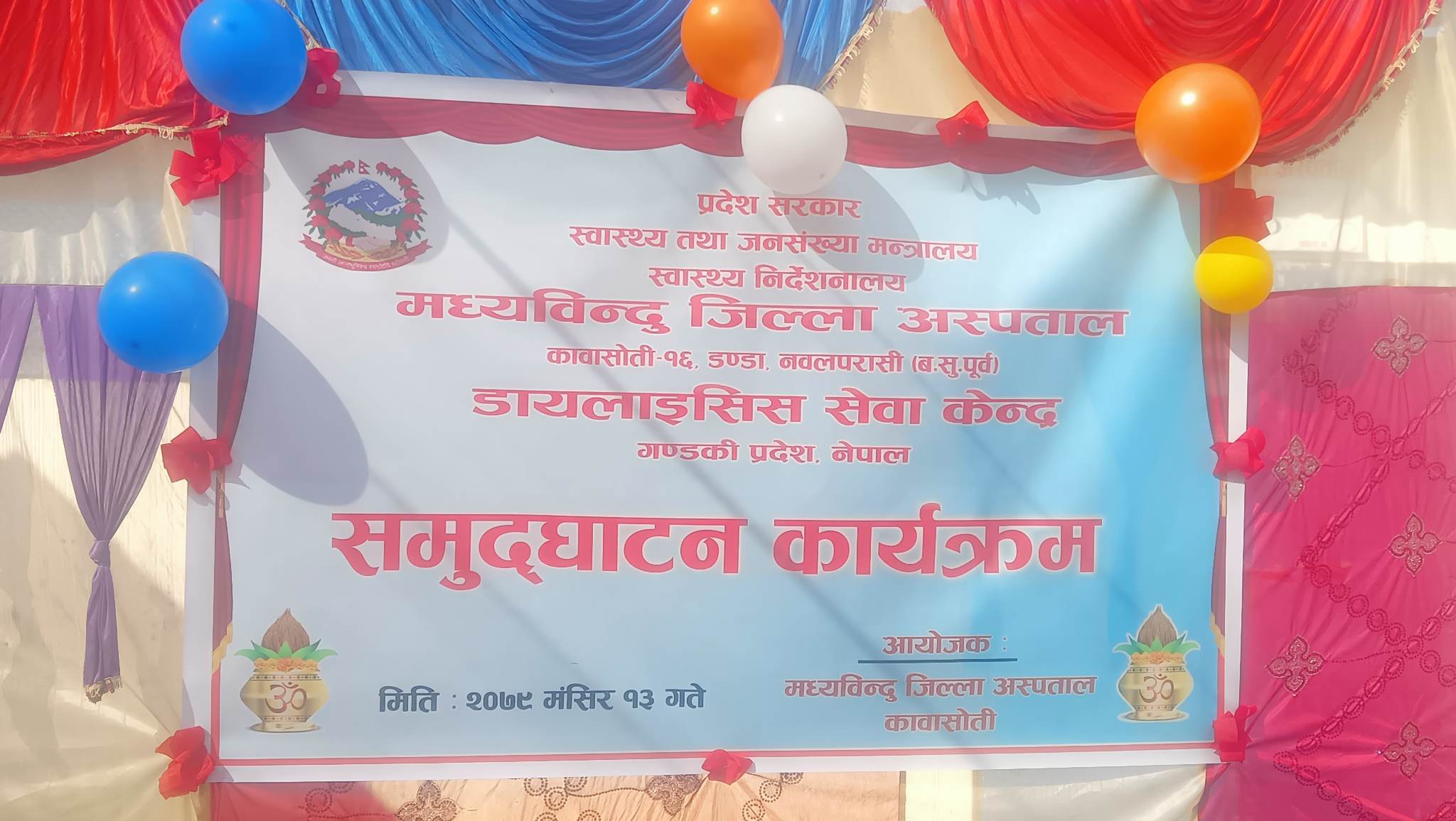 मध्यविन्दु जिल्ला अस्पतालमा मंगलबारबाट मृगौला रोगीको निशुल्क उपचार शुरु भएको हो । डायलाइसिस सेवाको गण्डकी प्रदेशका स्वास्थ्य तथा जनसंख्या मन्त्री मधुमाया अधिकारी गुरुङ्गले उद्घाटन गरेर शुरु गरेका थिए । अस्पतालका लागि गण्डकी प्रदेश सरकारले ४ वटा डायलाइसिस मेसिन निशुल्क प्रदान गरेको हो ।