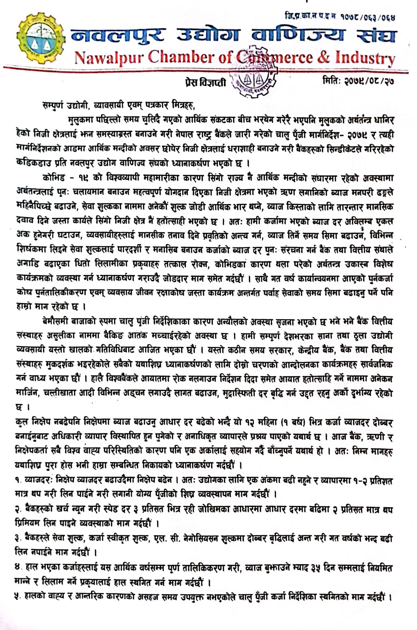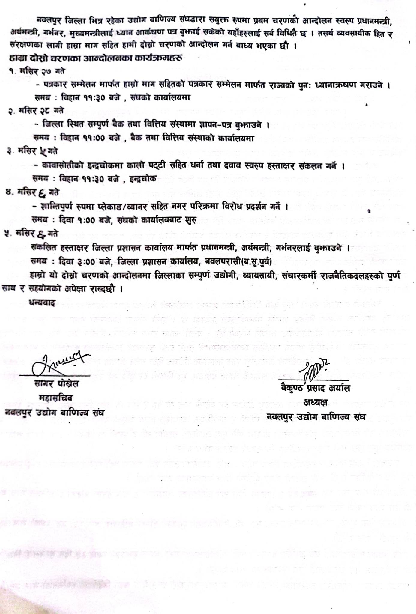 नवलपुर उद्योग वाणिज्य संघ, गैडाकोट उद्योग वाणिज्य संघ, मध्यविन्दु उद्योग वाणिज्य संघका पदाधिकारीहरुको उपस्थितिमा मंगलबार कावासोतीमा पत्रकार सम्मेलन गर्दै नवलपुरका उद्योगी व्यवसायीहरुले आन्दोलनको घोषणा समेत गरेका छन् ।